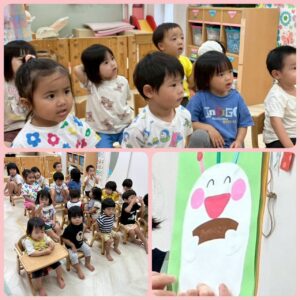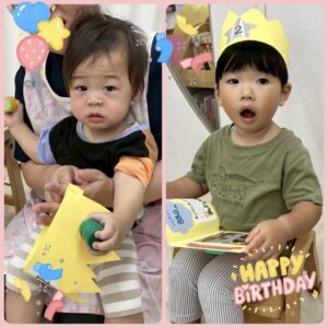 9月の誕生会🎉 2025年09月26日 9月の誕生会の様子です🎂 2人のお友だちのお誕生日をみんなでお祝いしました😊 カードと冠をプレゼントしてもらうとそれぞれ受け取り、嬉しそうに眺めていました🎁 お楽しみのコーナーはみんなで変身おばけのお話を見て楽しみました🤗 素敵な誕生会になりました❤