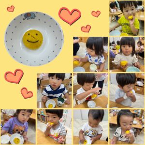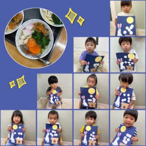 お月見🎑 2025年10月03日 先日お月見の製作を楽しんだ子どもたち! 今日は“お月見うどん”と“お月見蒸しパン”を食べて、食事でもお月見を味わいました🎑 今年のお月見は10月6日🌕 きれいなお月さまが見られるといいですね✨