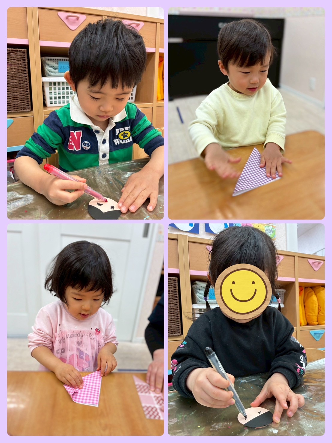ひな祭りや3月の製作を行いました! 折り紙を折ったり、自分たちで顔を描いたり… 真似をしたり、顔を描くことが出来るようになってきて、製作にも広がりが出てきました。