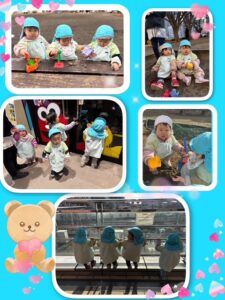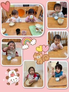 戸外では、砂場でスコップやカップを使い、夢中になって遊ぶ子どもたち😊お友だちに「どうぞ」と渡す姿も見られ、関わりを楽しんでいます❤️ お散歩では電車をみたり🚃、周りの景色に興味を示したりと、それぞれに発見を楽しんでいます✨ また、給食やおやつではスプーンやコップを使い「自分でやりたい!」という気持ちが育ってきました。歯ブラシ🪥も保育者と一緒に頑張っています💖