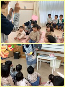 みんなの前へ出て、 ちょっぴり緊張ぎみのお友だち😖❣️ カードのプレゼントに『なんだろう』🙄と、 不思議そうなお顔をしながらも 早速開いて中を見ていました🤩