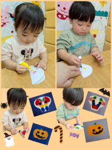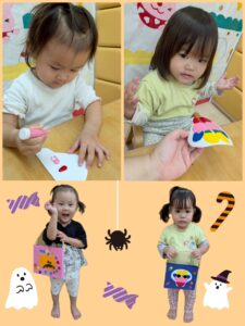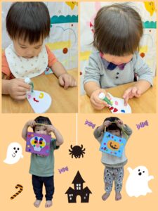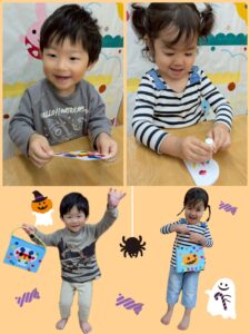 ハロウィンバッグ🎃りす組🐿 2025年10月24日 ハロウィンに向けてバッグを作りました★ デカルコマニーで骸骨を☠ カボチャの目、口はのりづけしました🎃 完成したものを見ると「かわいい!」と 嬉しそうなお友だち❣️ ハロウィン当日はこのバッグに お菓子をもらう予定です★