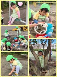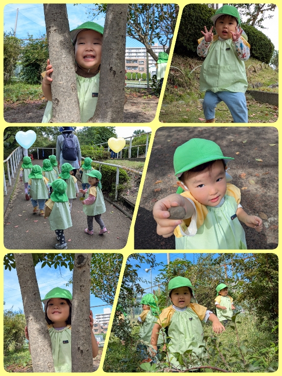 お散歩大好き❣️ うさぎ組 2025年10月24日 暑さも和らぎ、公園に出かけ遊ぶ事が増えたうさぎ組さん。 公園をのんびり散策したり、お砂場セットを持参して沢山遊んでいます。 「ここだよ〜🥰」と!お友だちと隠れん坊!! 「見て〜すごいでしょ✨😄」と砂場でお山を作ったり、遊具に登って自慢👍😁をし、外遊びを満喫しています。