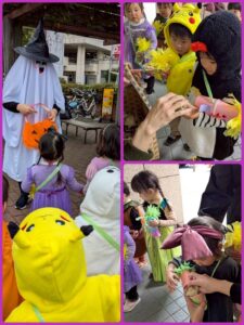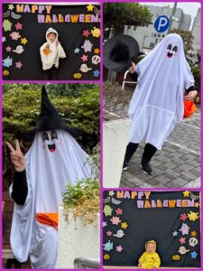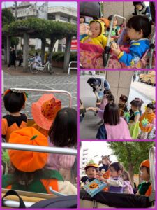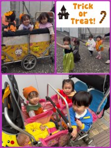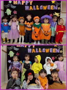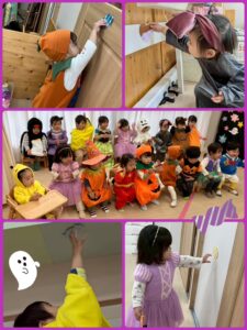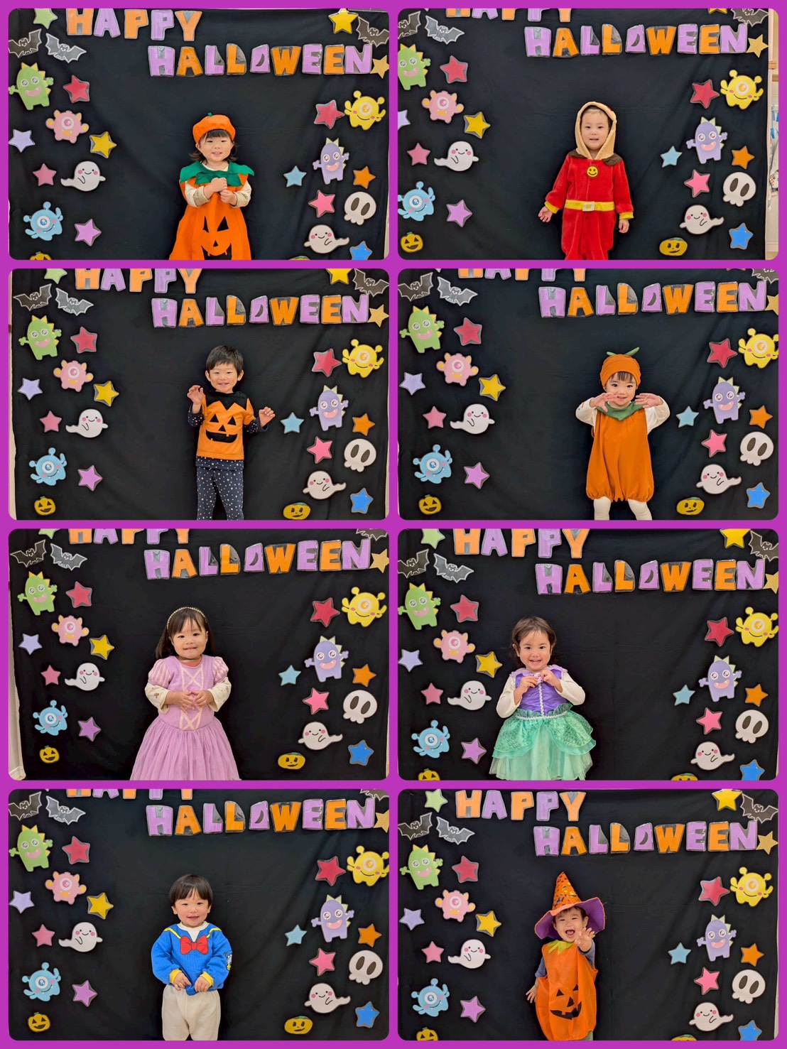 ハッピーハロウィン🎃① 2025年10月31日 今日は、ハロウィンパーティー🎃がありました🎶 みんなで可愛い❤衣装に着替えて、お散歩へ★ お菓子🍭をもらいに行きました☺️ 「お菓子、下さい!」「トリック・オア・トリート」と大きな声で言うことが出来ていました✨ お部屋に帰ってからは、お菓子🍭探しゲームを楽しみました😊 給食やおやつもスペシャルメニューで、みんなとても喜んでいました🎶