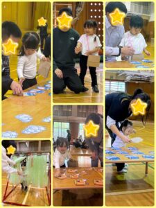 寒天遊び:うさぎ組🐰 2025年10月03日 寒天遊びをしました! 寒天の作り方を説明すると、皆真剣に聞いていました😉 初めて見る赤🟥緑🟩黄色🟨の寒天に恐る恐る触ると、「冷た〜い😆」と言っていたお友だち😄 ヘラで切ってお皿に入れたり、コップ🥛に入れジュースに見立てた遊び方を見せると、「やりた〜い😄」と大興奮! 遊び始めると夢中になり、「ジュース🧃出来たよ🎶」「山盛り〜✨」と寒天遊びを楽しみました★