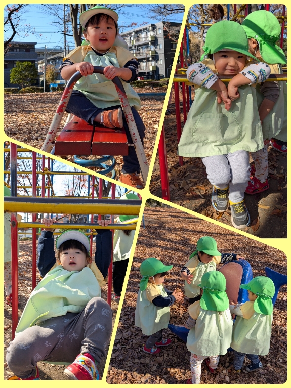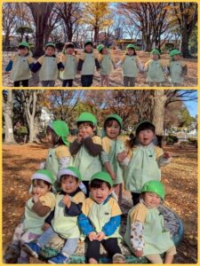 元気いっぱい!:うさぎ組🐰 2025年11月28日 暖かい日差しの中、元気いっぱい遊んで来ました😄✌️ 公園にはケヤキの落ち葉がいっぱい🍂 遊びを見つける天才のお友だち!! 落ち葉を抱え「まて🍃〜」と追いかけっこが始まり落ち葉合戦に😁 クジラ🐋の口に葉っぱを山盛りにして、🍠パーティーが始まり棒でツンツン。 空中に撒いて風にひらひら~っと舞い踊る様子を楽しんでいました🎶
