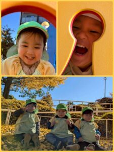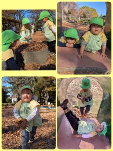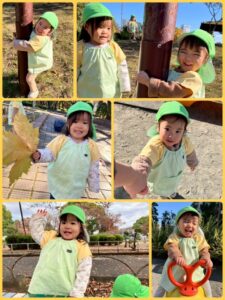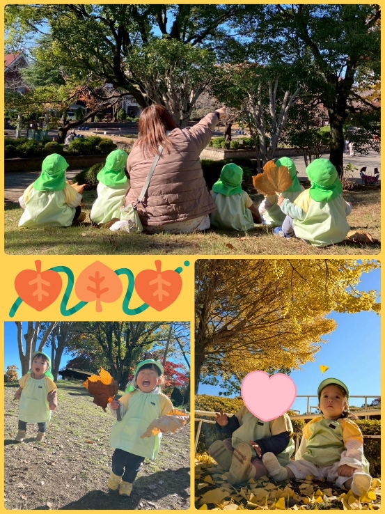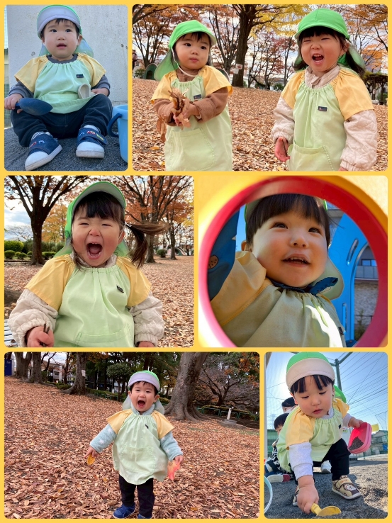 外遊び🍂:りす組🐿 2025年11月14日 落ち葉遊びが楽しい時期になりました🍂 「葉っぱのシャワー!」と落ち葉のかけ合いっこをしたり 足で踏みカサカサと音を立てたりと楽しんでいます🥰 寒い日も増えてきましたが 元気いっぱいお外遊びを楽しみたいと思います✨
