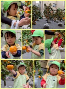 みかん狩り🍊:うさぎ組 2025年12月05日 みかんの美味しい季節🥰 連携園さんのみかん狩りに参加させてもらいました🎶 園庭にはたくさんのみかんの木🍊! 「枝の軸を持って、みかんをクルクル回すと採れるからね〜😄」と話を聞いてから一人ずつみかんを採りました。 「どれにする?」「おいしそうだね😋」 真剣な顔でみかんを🍊クルクル回して、ゲットできました✨