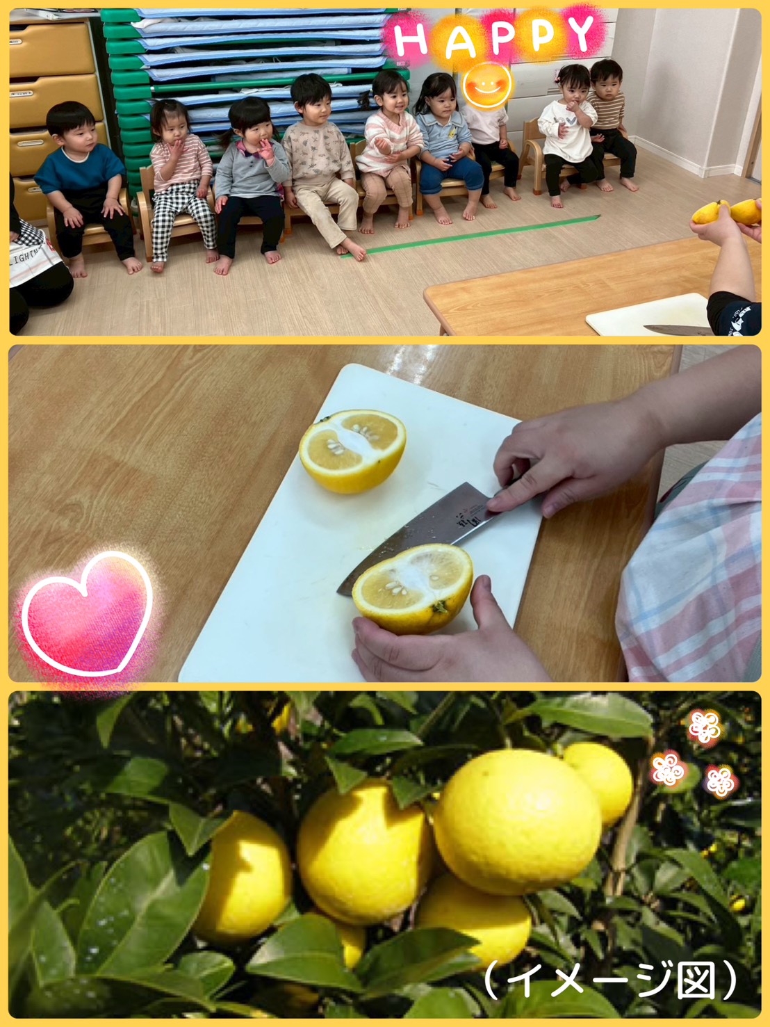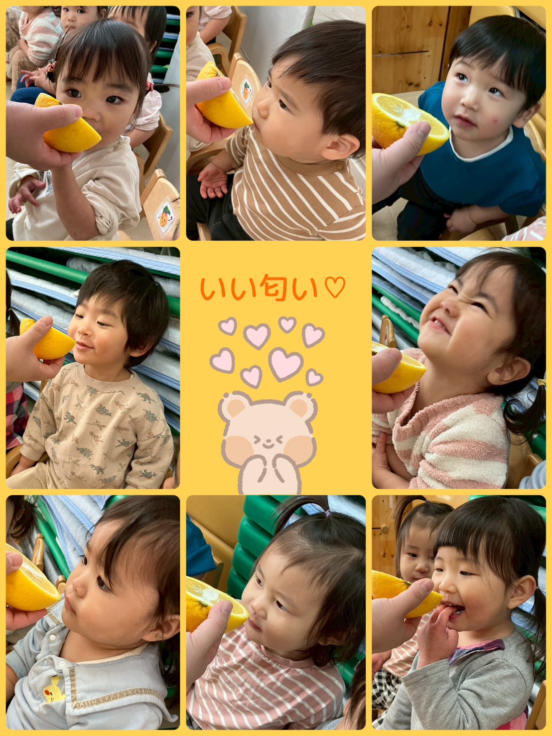 みかん観察🧐:りす組🐿 2025年12月05日 近隣施設にあるみかんの木🍊 春から成長を見守り、大きくなるのを楽しみにしていた、 りす組のお友だち🫶 先日、許可をいただいて1つ 収穫させていただきました🌟 保育園に戻り先生が包丁で 半分に切りみんなで観察👀! クンクン匂いを嗅いでみると 美味しそうな香りがしました🍊