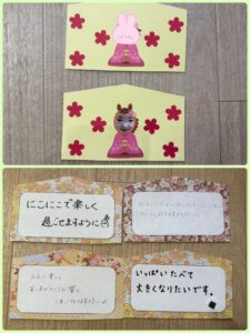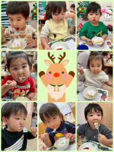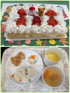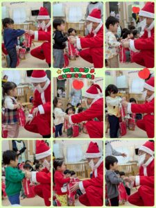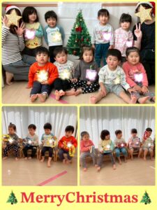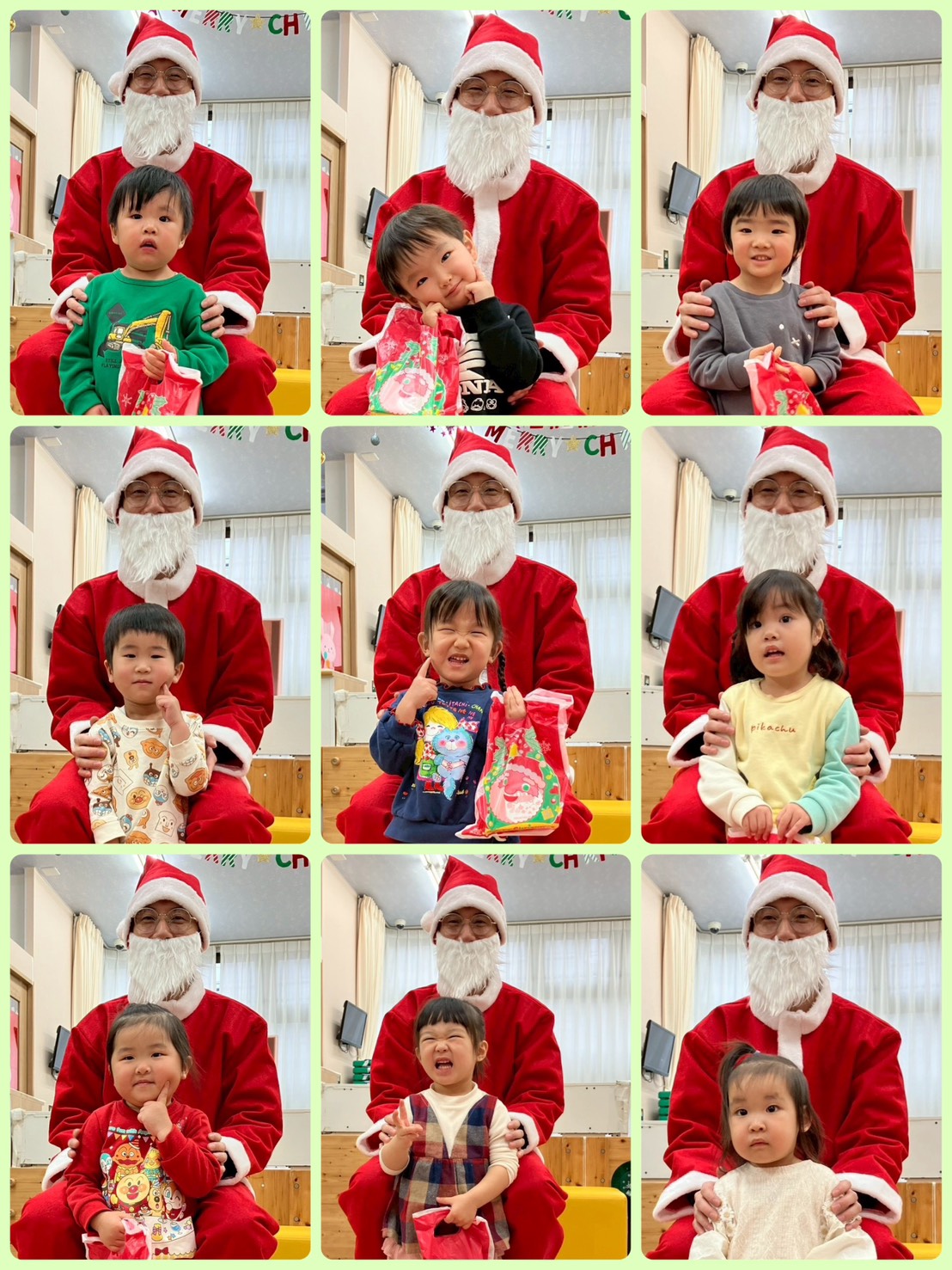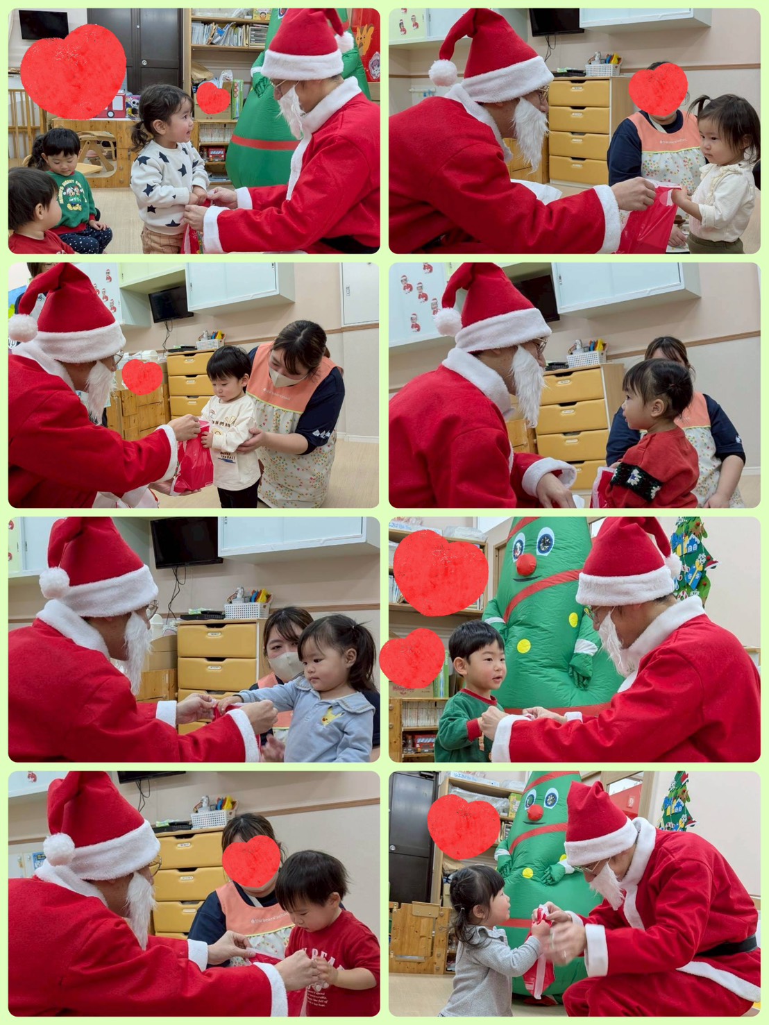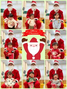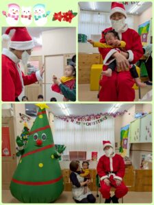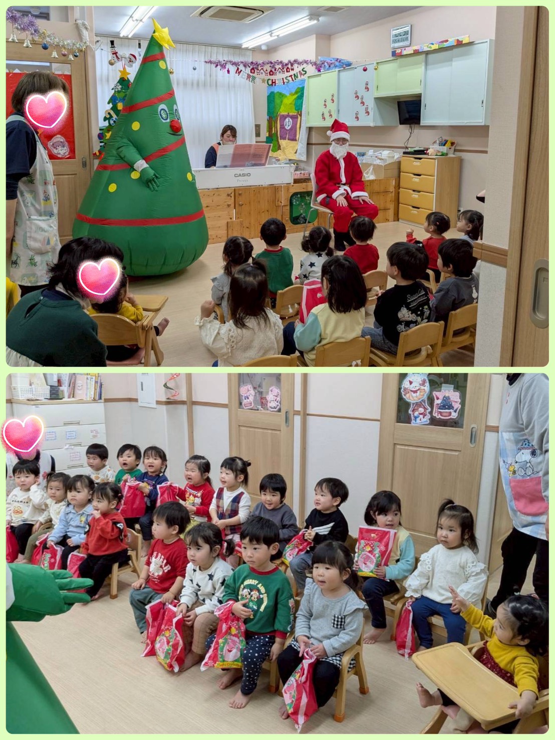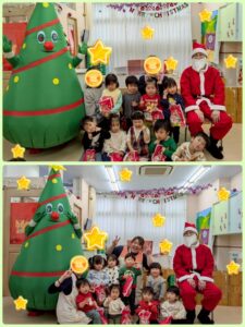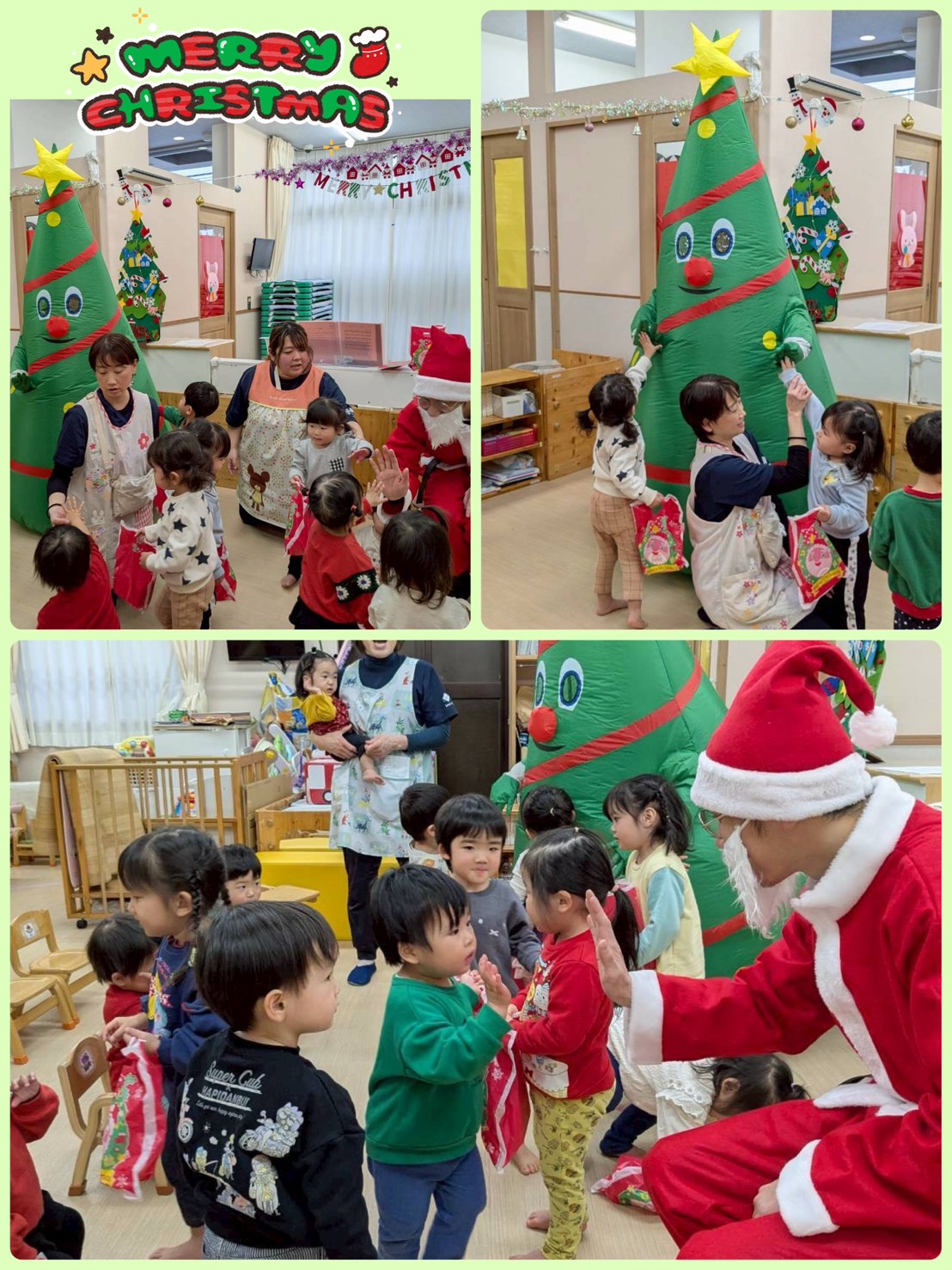 クリスマス会① 2025年12月27日 クリスマス会🎄がありました😊 鈴の音が聞こえてくると、サンタさん🧑🎄とツリー🎄さんが登場! 白い大きな袋にプレゼント🎁が入っていて、一人ひとりサンタさん🧑🎄から受け取りとても嬉しそうなお友だち🎶 少しドキドキ💓しながらも、一緒に記念撮影をし、楽しい一日になりました😊