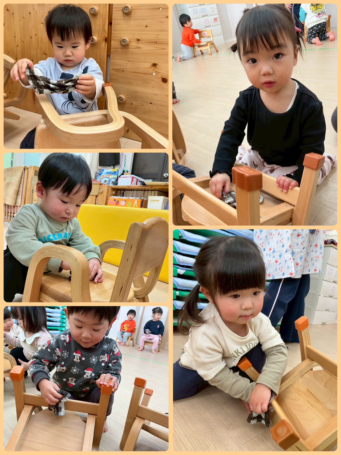 大掃除✨:りす組🐿 2025年12月26日 春から使ったお部屋とお椅子を掃除で綺麗にしました🧹 雑巾がけレースは大盛り上がり♪ 初めてのお掃除でしたが 先生のお話をよーく聞いて、 上手に真似っこして楽しんでいました🫶
