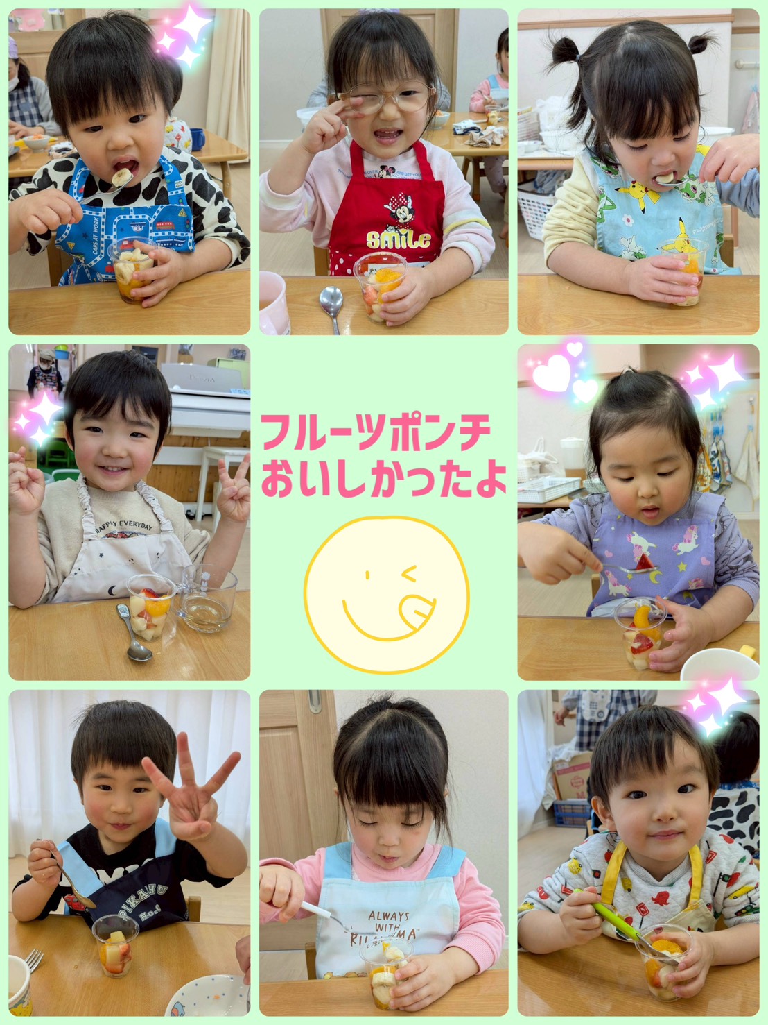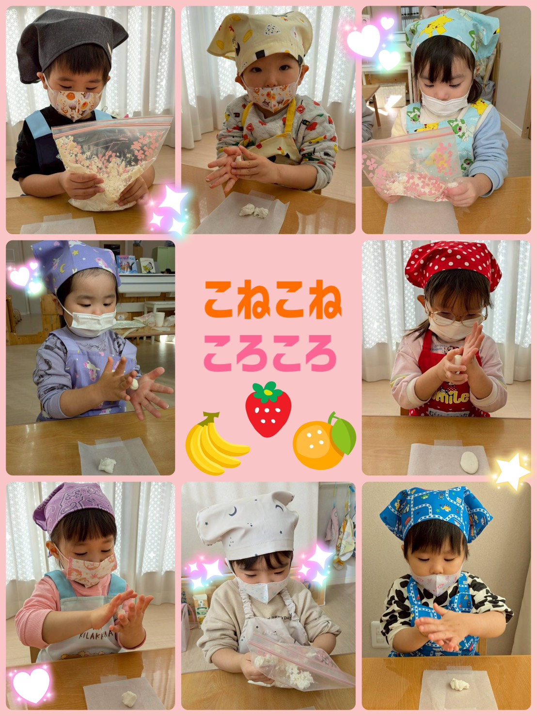楽しいクッキング🎶 うさぎ組 2026年01月21日 待ちに待ったクッキング✨ 「今日は楽しみにしていたクッキングで〜す🎶」「ヤッター✨」「イェーイ🥰」と歓声が挙がったうさぎ組さん。 豆腐と白玉粉の種を、コロコロ🤗ペタペタ😊 白玉団子を作りました。 給食のデザートは、フルーツポンチ🍓🍌🍊🍑 「美味しいね〜🥰」「またやろうね✨」みんな いっぱい食べました❣️