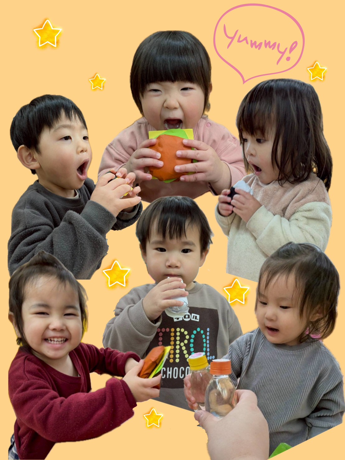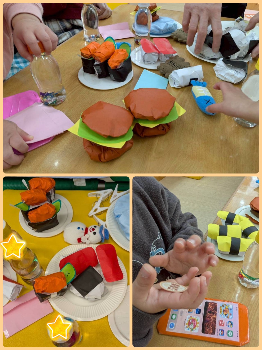 お店屋さんごっこ❣️:りす組🐿 2026年01月24日 お店屋さんごっこをしました🥰 お金を手に、 お寿司🍣やハンバーガー🍔を「くーださい!」と買いに行きます🌟 言葉のやり取りが増えてきた りす組さん🐿️とても楽しんでいました❣️ おいしそうなご馳走を囲んで みんなで「いただきまーす😋」 仲良くパーティをしました🎈