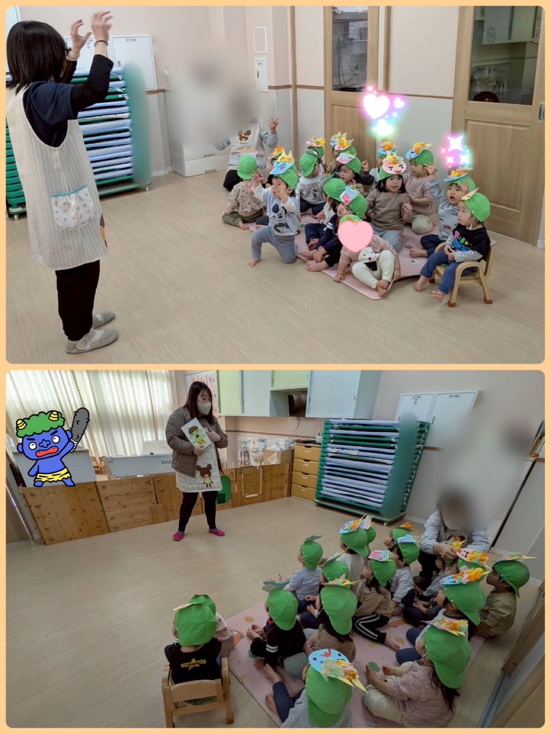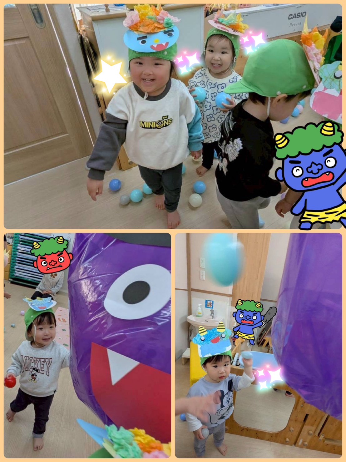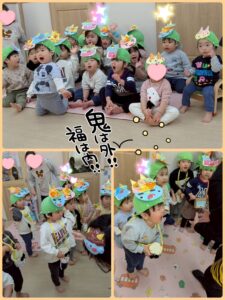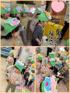 ゲームの後は、鬼👹さん登場! 泣いてしまうお友だちもいましたが、持っている豆を投げ、「怒りん坊鬼」「泣き虫鬼」「イヤイヤ鬼」を退治しました✨✨