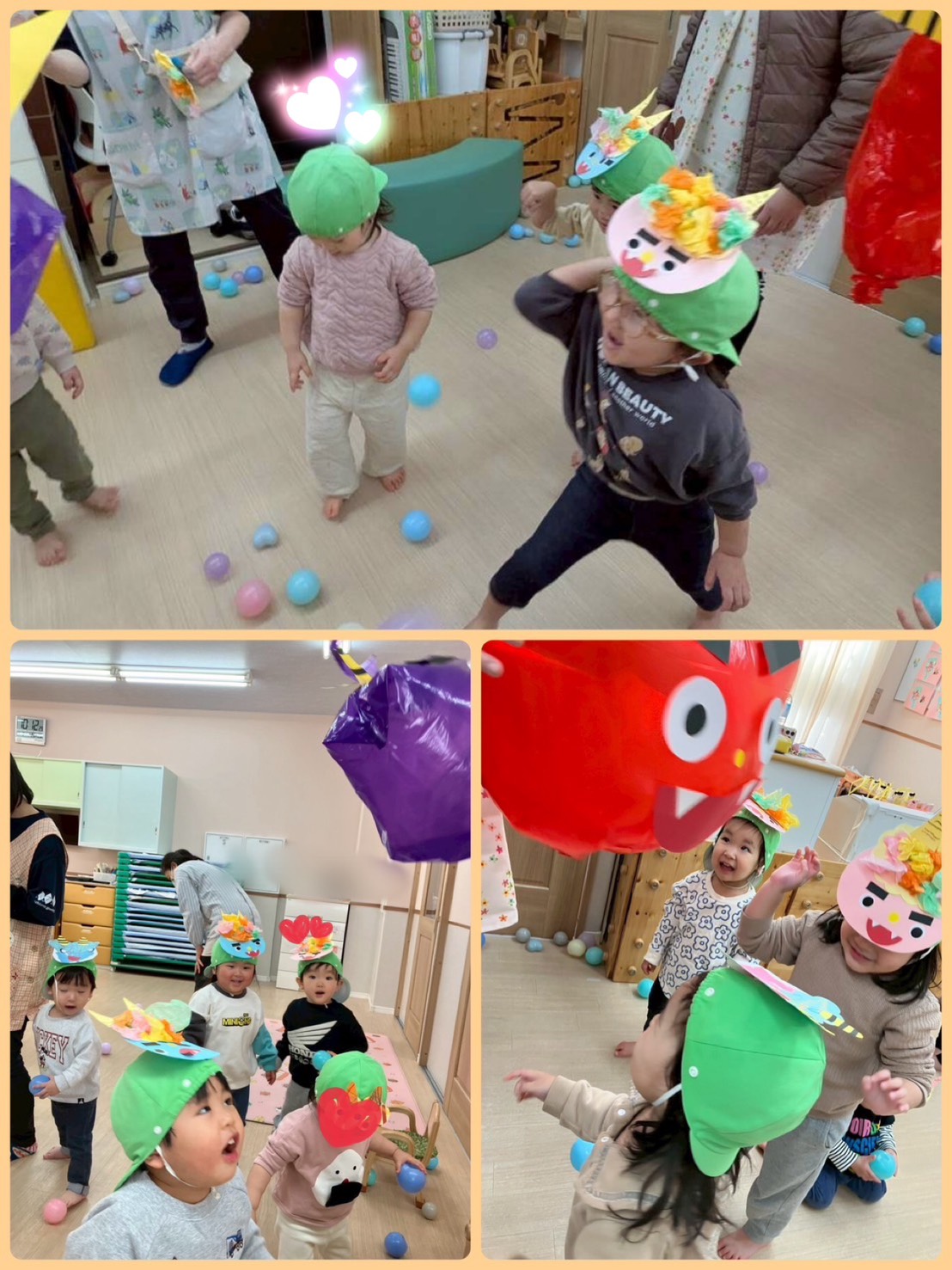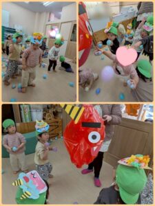 今日は節分会👹 初めに 大きなポリ袋の鬼👹さんにボールをあてて退治するゲーム! 一生懸命ボールを拾い、頑張って💪あてていました😊