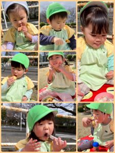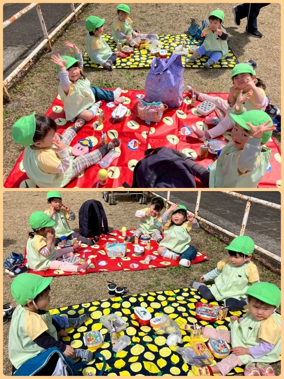 ピクニック🍙:りす組🐿 2026年03月27日 近所の公園におうちの人が作ってくれた お弁当を持ってピクニックに行きました🍱 お外で食べるお弁当は格別においしくて、、、😋 とても嬉しそうなお友達でした🫶