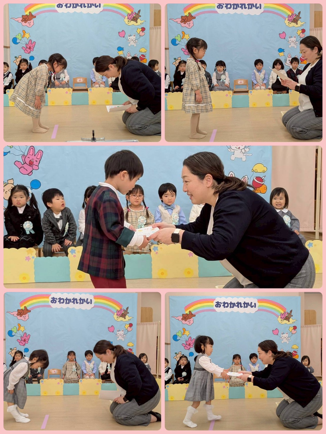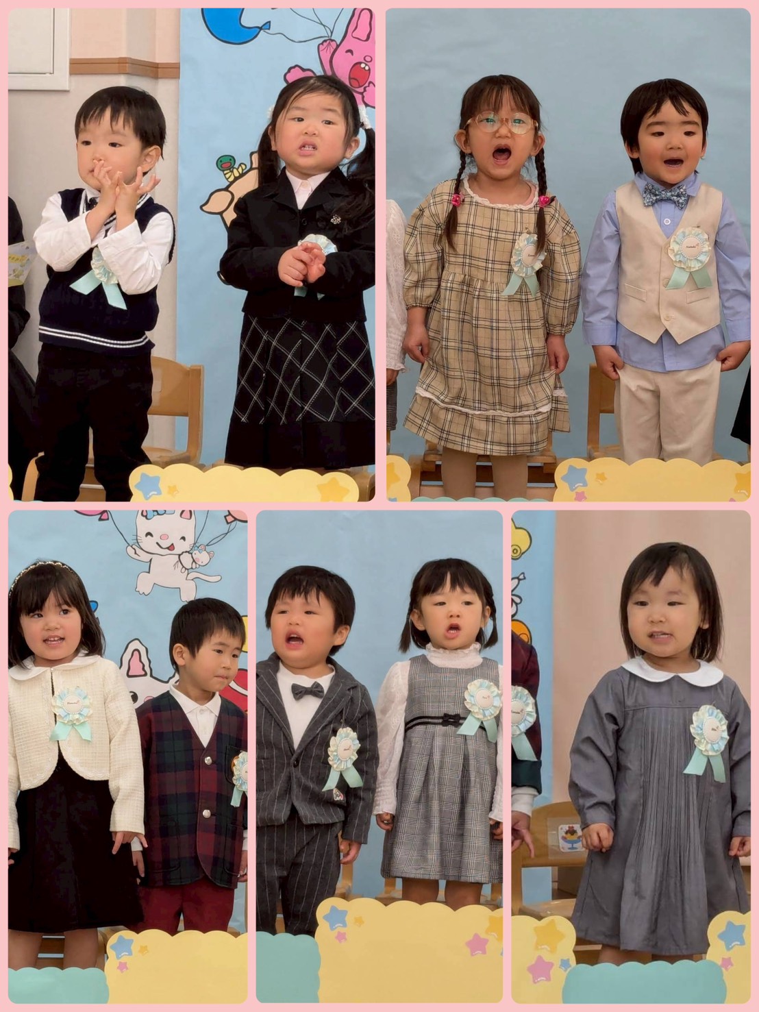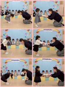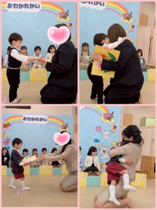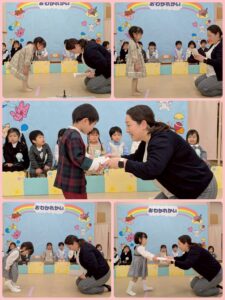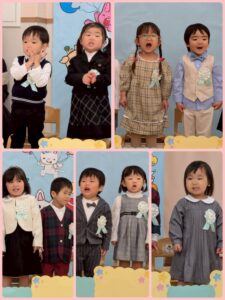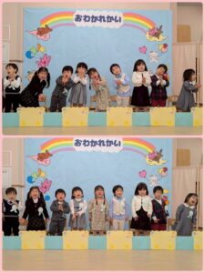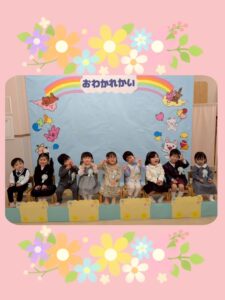 お別れ会✨うさぎ組🐰① 2026年03月27日 うさぎ組🐰さん 最後の行事の「お別れ会」がありました☺️ 登園してくると、いつもと違う雰囲気に ドキドキ💓していましたが、お友だち同士 顔を合わせると、緊張がほぐれ、元気に会に 参加していました☺️ たくさん練習をしてきたお友だち😊 お父さんやお母さんの前で、元気に、大きな声でお返事したり、歌を歌ったり、とても上手に出来ました✨✨ うさぎ組🐰で過ごすのも、あと少しですが、 たくさんの思い出を作りたいと思います✨