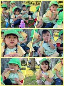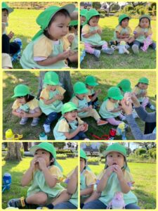 美味しいね❣️ うさぎ組 2025年09月26日 暑さが少し和らぎ爽やかなお天気の中、おやつ🍘を持って、公園に遊びに行きました✨ 芝生に到着してから「今日はお外でおやつを食べま~す😊」「ヤッター!!✌️」「おせんべいだ❣️🍘」と大喜びのお友だち。 おやつの後は、元気いっぱい走り回り、たっぷり遊んで来ました。