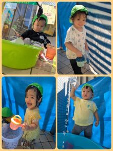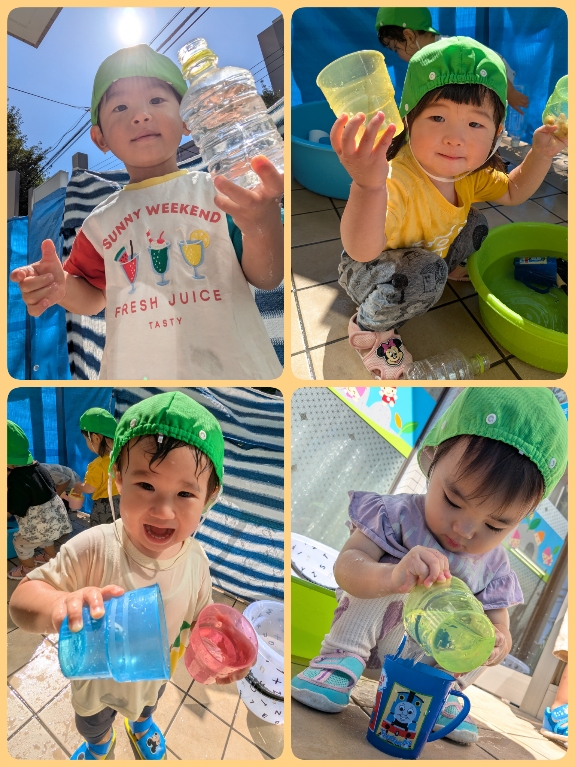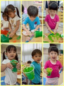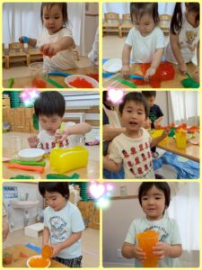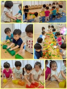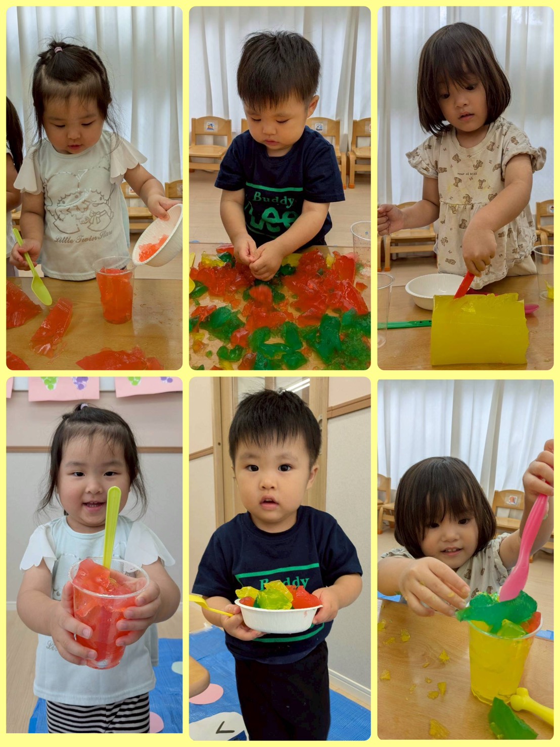 寒天遊び:うさぎ組🐰 2025年10月03日 寒天遊びをしました! 寒天の作り方を説明すると、皆真剣に聞いていました😉 初めて見る赤🟥緑🟩黄色🟨の寒天に恐る恐る触ると、「冷た〜い😆」と言っていたお友だち😄 ヘラで切ってお皿に入れたり、コップ🥛に入れジュースに見立てた遊び方を見せると、「やりた〜い😄」と大興奮! 遊び始めると夢中になり、「ジュース🧃出来たよ🎶」「山盛り〜✨」と寒天遊びを楽しみました★