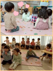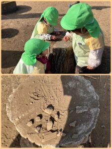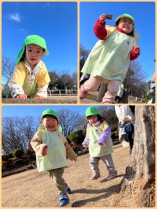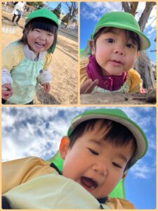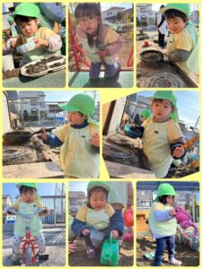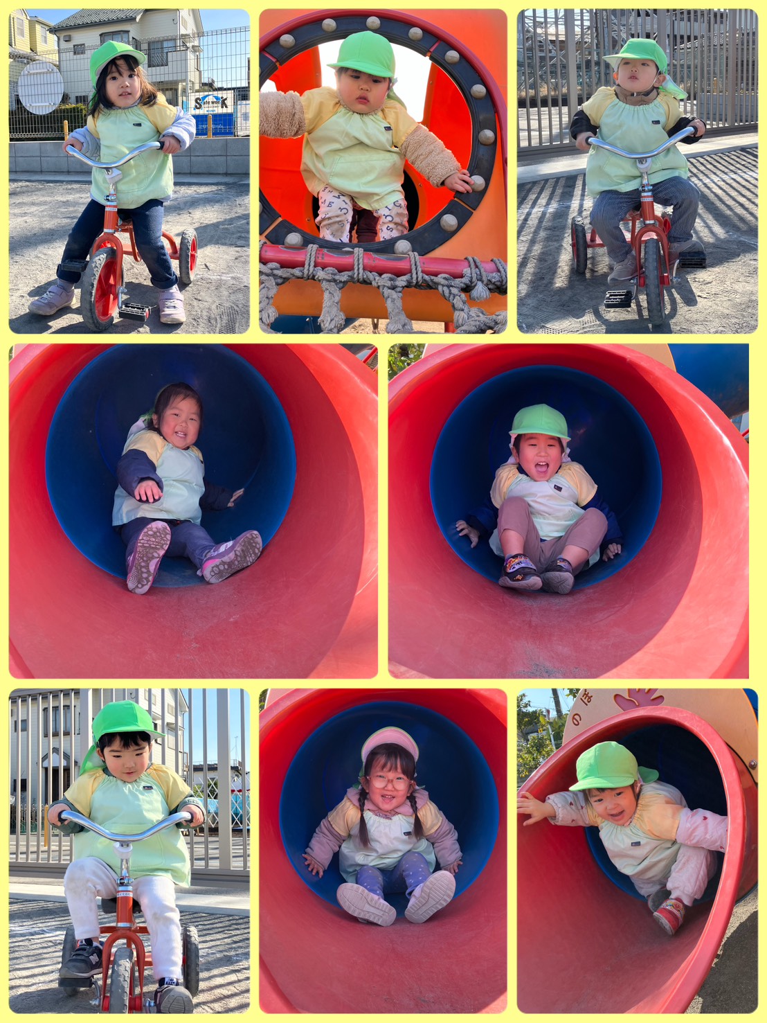 「おはようございます!」と元気に挨拶をしてから、砂場でままごと、固定遊具の滑り台🛝や三輪車等で沢山遊んで来ました。