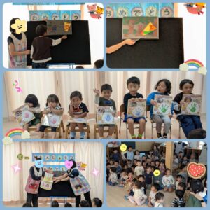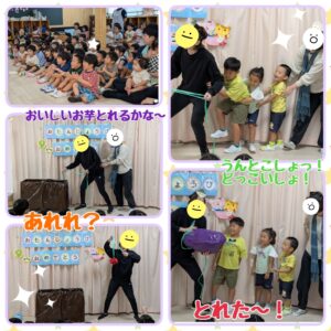 保育者からの出し物は「大きなさつまいも」の劇でした✨お誕生日のお友達にはお芋掘りを手伝ってもらい大きなさつまいもを掘ることができましたよ!🍠 最後に大きなさつまいものケーキを作って食べました🍰✨