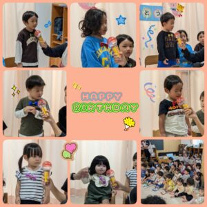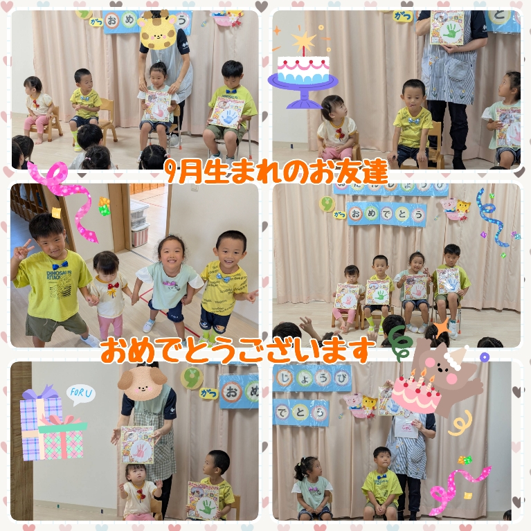 先日、9月生まれのお友達4名の誕生会を行いました!! 4人で仲良く手を繋いでニコニコで入場し、保育者からのインタビューも元気に答えていました! みんなから歌のプレゼントや先生達からの色紙のプレゼントをしてもらってとても嬉しそうな姿が見られましたよ🎶