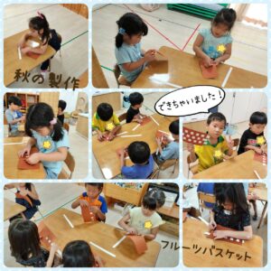 暑い暑い夏もようやく終わりが見えてきましたね!!ぞう組さんは一足早く秋を手作りしましたよ🍁🍂画用紙を差し込む作業では「えっ?次はどっち?」「あれ~、同じになる💦」などと言いながら、友達同士助け合い、素敵なフルーツバスケットを完成させていました🍎🍇🌰 共同製作では、入れたいものが盛りだくさん!イメージがまとまるまでにもたくさんの時間をかけました。何度も行っている共同作業🎨だけあって、順番に色を塗っていくのもお手のもの😆作業はスイスイ進んでいきました!