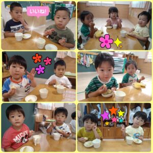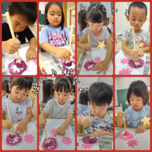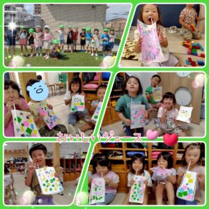 毎日、元気いっぱいなきりん組!にじみ絵でジュース作りを行い、自分で描いた大きなコップに好きな色を付けて、水をかけてにじませて、キラキラの折り紙などでトッピングも作り、オリジナルのジュース作りをとても楽しんでいました!
