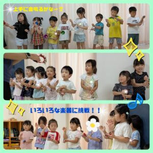 いろいろな楽器を鳴らしたりリズムに合わせて体を動かしたりとても楽しそうに参加していますよ♪また来月のリトミックが楽しみですね☺️
