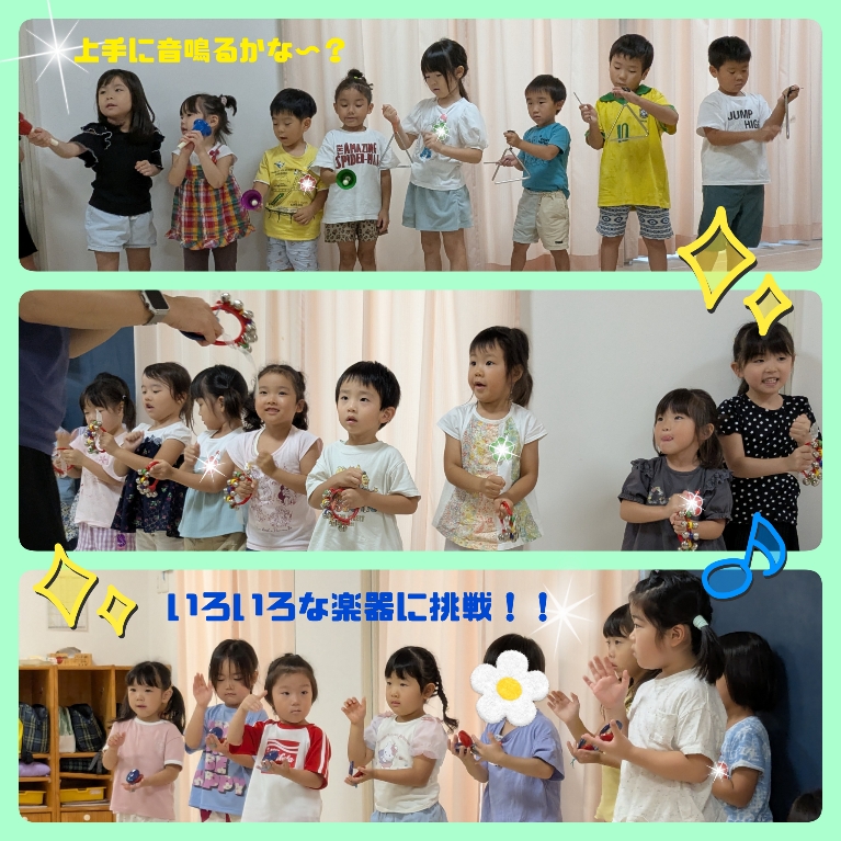 またカスタネットや鈴、ベルやトライアングルなど様々な楽器を使って「どうやったら上手に鳴らせるかな〜」とリトミックの先生の鳴らし方を見ながら試行錯誤している姿が見られました!👀