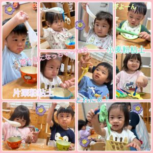 次に、小麦粉粘土と片栗粉粘土です🤲🏻片栗粉は初めてだったので初めは恐る恐るでしたが、とろ〜んとゆっくり落ちるところをじっくり眺めて、夢中になっていました😳寄り目になっちゃう可愛い表情をぜひご覧ください🩷残り半年となったりす組ですが、色んな経験を一緒に重ね、まだまだたくさんの思い出を作っていきます☺️