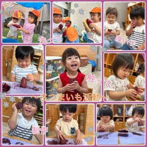 戸外遊び以外にも最近楽しんだことをご紹介します。現在お部屋に飾っているさつまいも製作です🍠まずは、水遊びの中で芋を洗ってもらいました✨スポンジでこする子やジョウロで水をかけてあげる子もいましたよ!そして、半分に切った芋を触ったり、匂いを嗅いだりすると「くさっ!」という反応が返ってきて大笑いでした😂その後に製作を行っています。紙いっぱいが紫色になるくらい、芋スタンプを楽しむみんなでした⭐️これ以降「さつまいも」を言えるようになる子が多く、ご飯に入っていると喜んでいます♩興味をもってくれたようで嬉しいです😊