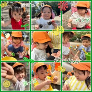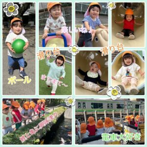 やっと戸外遊びを楽しめるシーズンになり、りす組の子ども達も大喜びです!!電車を見に行ったり、香福寺で鯉や亀に餌をあげたり、神社や恐竜公園、屋上で思いっきり遊んだりと、毎日アクティブに楽しんでいます⭐️🎶そして、ほとんどの子が外でも友達と手を繋いで歩けるようになりました🤝🏻自分の足で歩くと色々な発見があるようです。乗り物や生き物、お店、街中の色、植物などなど👀🌱遊びの中でも発見はいっぱい!!ダンゴムシやバッタ、松ぼっくり、葉っぱなどを見付けてじっくり観察!「かわいいね」「こわい」「きいろ!」「ジャンプ!」「赤ちゃん?」「持って帰る!」など、子ども達の視点は面白いです😌
