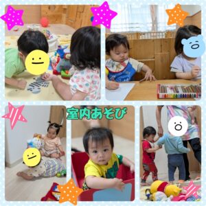 室内あそびでは、引き続き音の鳴る玩具や知育玩具で遊んでいますが、特に高月齢児はなぐり描きやシール貼りなどの手先を使った遊びもできるようになり成長を感じています🤗また、全体的に動きも安定してきて、歩いたりハイハイしたり、座れるようになったりしてきています😃