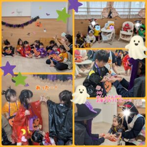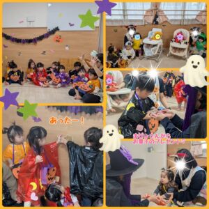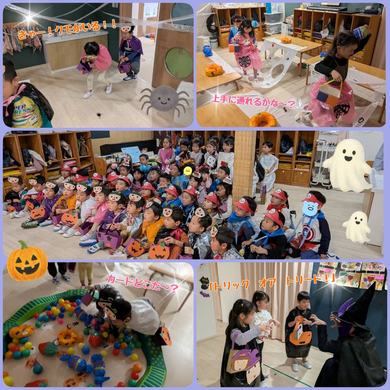 幼児クラスでは暗いお部屋でたくさんのミッションをクリアして魔女に会いに行きました!クモの巣やポリ袋の下をくぐったり穴の空いてるところを歩いたりいろいろなミッションをクリアしてカードを見つけることができたお友達✨️その後は魔女のお部屋に行って大きな声で「トリック オア トリート!」と言うことができ魔女からお菓子を貰うことができましたよ🧙🍪✨️