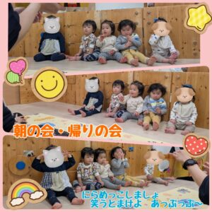 朝の会や帰りの会では、壁ぺったんして行っています。 保育者が「えほんよもう」「お茶のむよ」と声を掛けると自分から壁ぺったんをしていますよ😊
