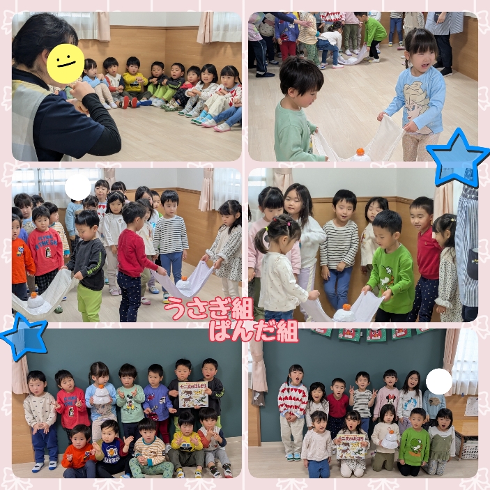 新年お楽しみ会では、鏡餅リレーや干支並べリレーで大活躍!最後は獅子舞さんに頭をカプッ!今年も元気に過ごせそうですね😊