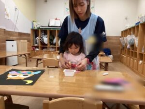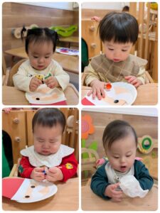 目と鼻には丸いシールを貼りましたが、手にくっついてなかなか貼り付いてくれないシールに困り顔になってしまう子もいました🎄困った顔もとっても可愛い🩷指先を使いながら頑張る姿を見ていて、嬉しい気持ちでいっぱいになりました🥰