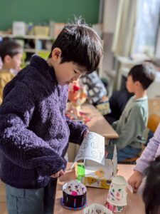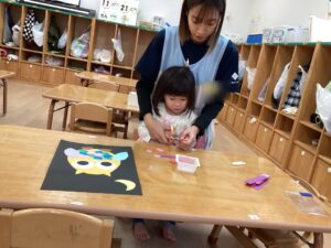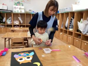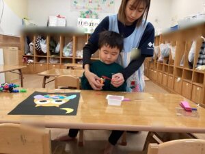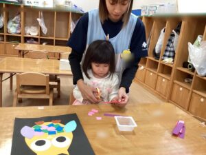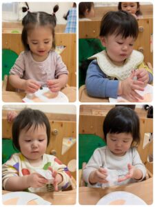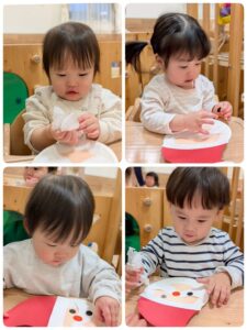 目と鼻には丸いシールを貼りましたが、手にくっついてなかなか貼り付いてくれないシールに困り顔になってしまう子もいました🎄困った顔もとっても可愛い🩷指先を使いながら頑張る姿を見ていて、嬉しい気持ちでいっぱいになりました🥰
