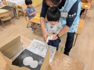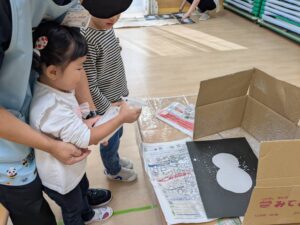 黒い画用紙にスプレーに入った白い絵の具を吹きかけました!普段あまりしないことなので、子どもたちも興味深く取り組んでいました👍🏻雪をイメージして吹きかけてみました☃️