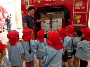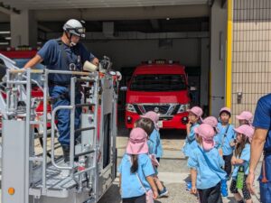 救急車、指揮車、ポンプ車、レスキュー車など中を見せていただいたり、乗せて頂いたり!子どもたちは、もう大興奮!その上、はしご車は実際に動かして下さって、ビルの上まで伸びていくはしご車を「きゃ〜すごーい!」