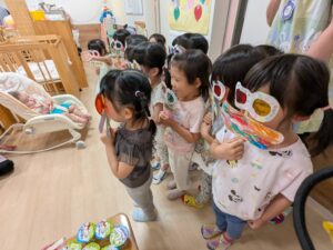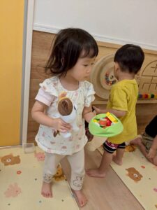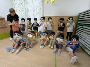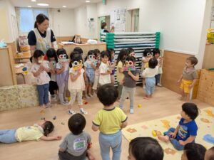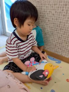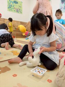 自由遊びでは、久しぶりにぬいぐるみで遊びました!!ぬいぐるみに食べ物をあげたり、お散歩させたりとお世話をする姿が多く見られました!!