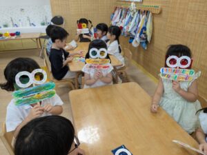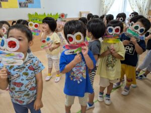 カラフルなメガネを覗いてお友だちと微笑み合ったり、羽根をパタパタさせて喜んていました。