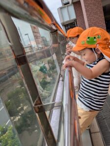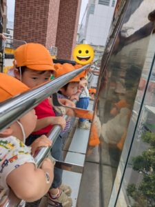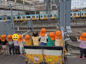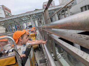 タイミングよくモコロン電車が来ると指をさして、保育者にモコロン電車が来たことを伝えていました😄
