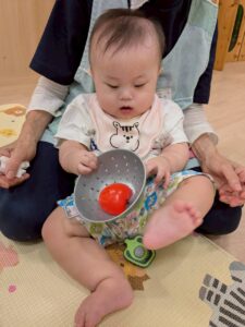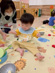 おままごとで遊びました!食べ物の玩具を手渡しであげたり、もらったり。
