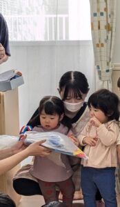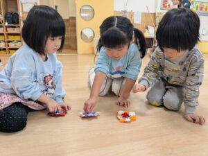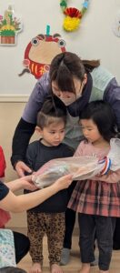 先生からは羽付きや福笑い、たいよう組さんからはこまをお正月遊びとして各クラスにプレゼントをしました🎁💫