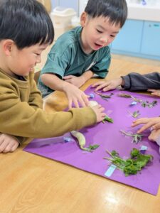 七草がゆに入れる、春の七草を覚え、本物の七草を視覚、触覚
