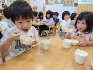 新年初の登園に、泣いてしまう姿も見られましたが、おやつを食べると元気いっぱいでニコニコ笑顔になっていたそら組さん😊