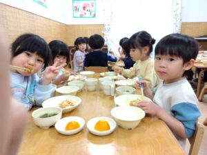 野菜スタンプを行いました🥕青梗菜と人参を目の前に、目をキラキラと輝かせていました✨