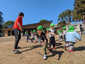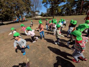 集団遊びでは、しっぽとりやバナナ鬼をして体を思いきり動かしながら、「負けないぞ!」「がんばれ!」と友だちを応援する声も聞かれ、楽しみながら参加する姿が見られました。